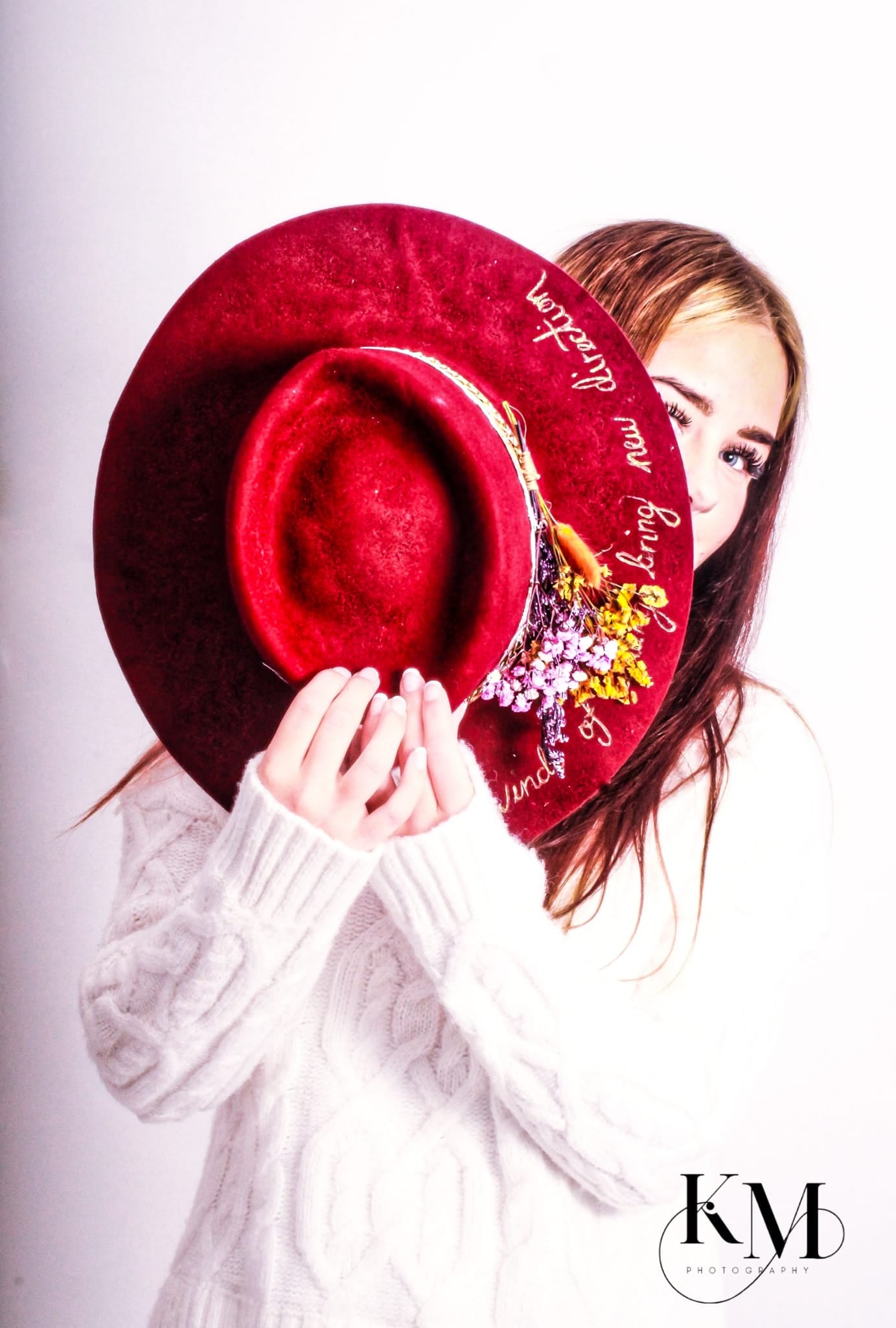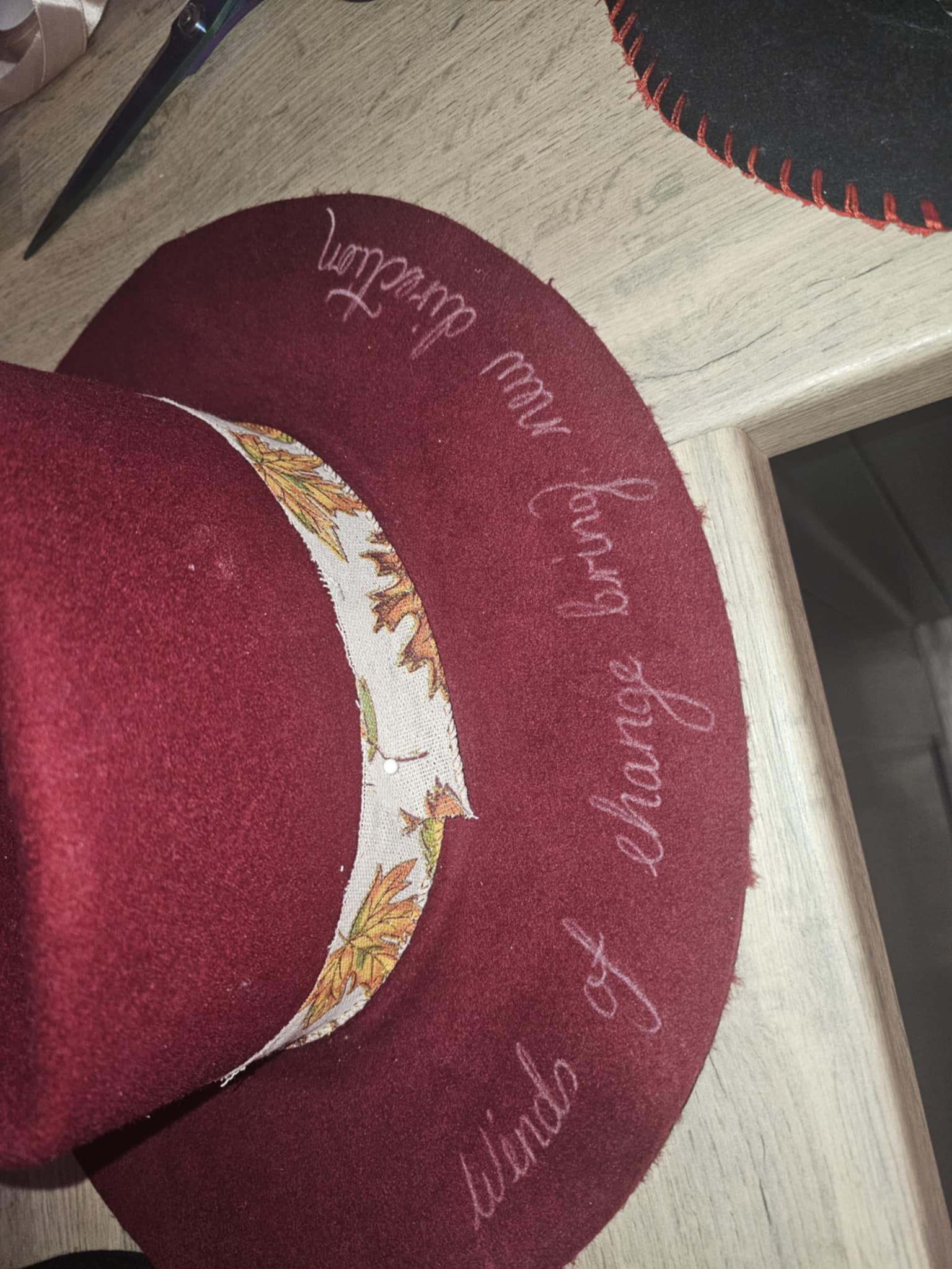 Burgundy wool creates the perfect canvas for a hand-etched message—"winds of change bring new direction"—plus a leafy printed band and pops of vibrant orange and lilac florals. Cozy up to fall’s bold side in this limited-edition statement piece.