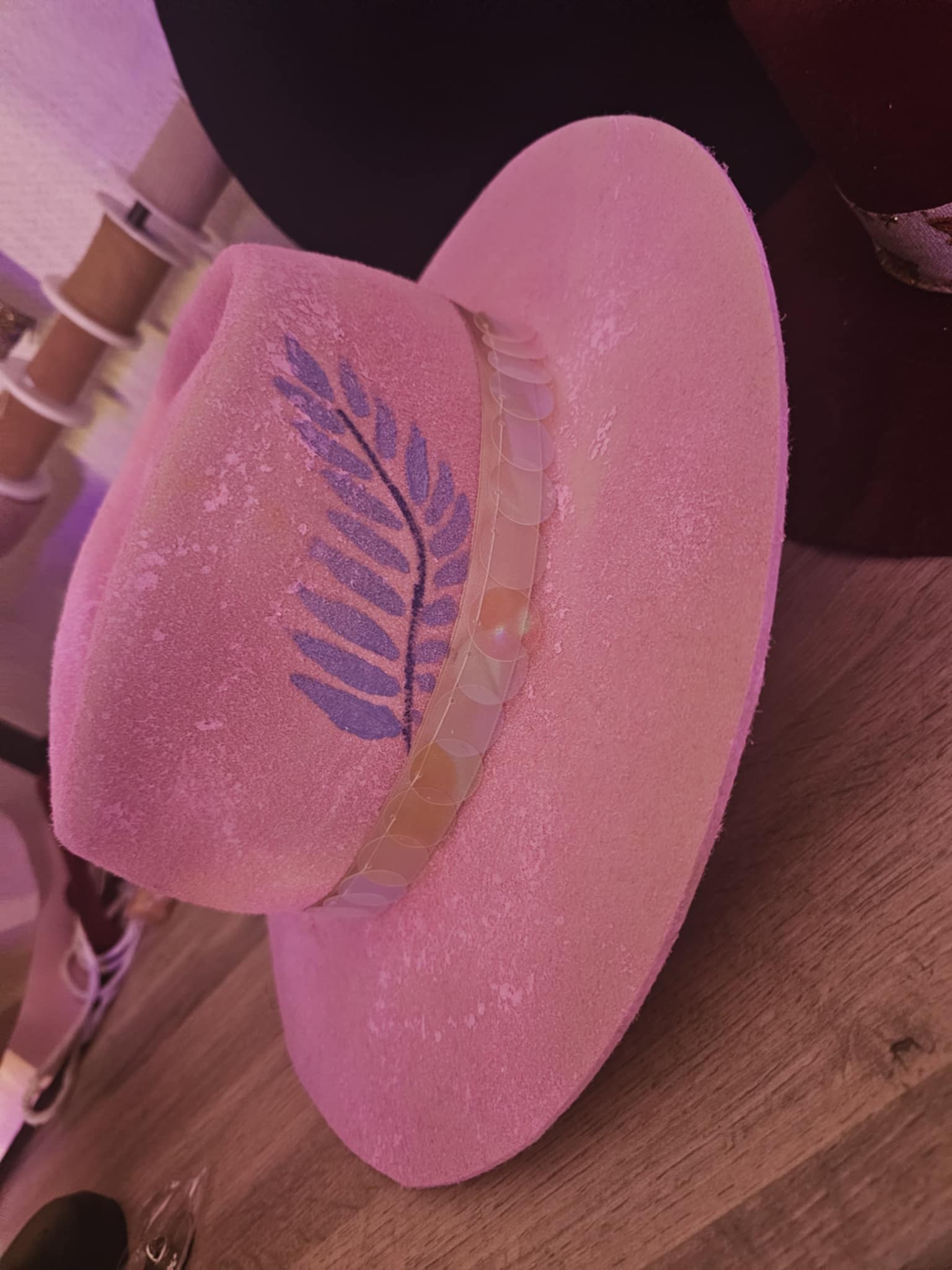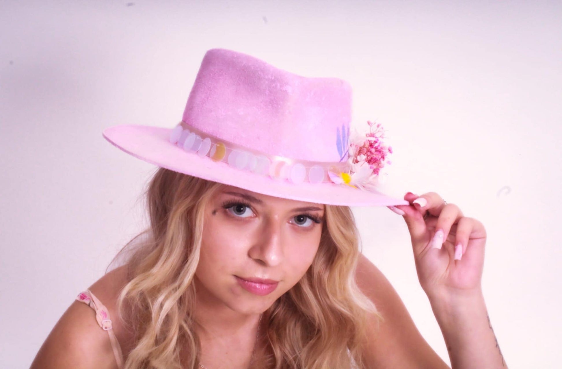This pastel pink hat features a playful love heart crown, hand-painted blue leaf, a shimmer band of pearlescent discs, and a burst of pink-and-purple florals.