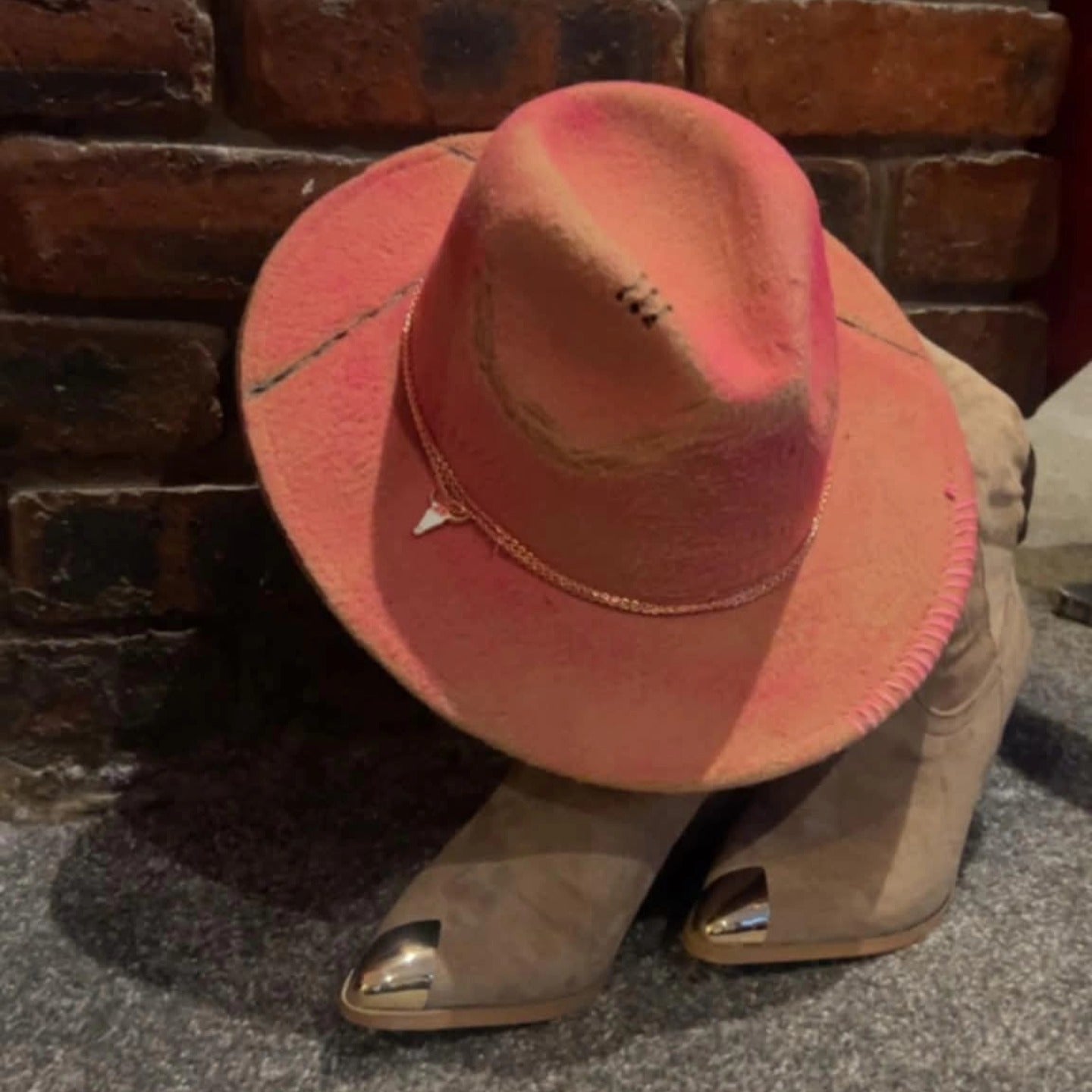 Add a splash of fun to your wardrobe with the Rodeo Rose, a playful pink cowgirl hat made from soft felt. It’s decorated with cheerful geometric etching and a charming flower cow skull that brings a quirky twist to classic western style. Perfect for brightening up any outing with a touch of spirited personality.