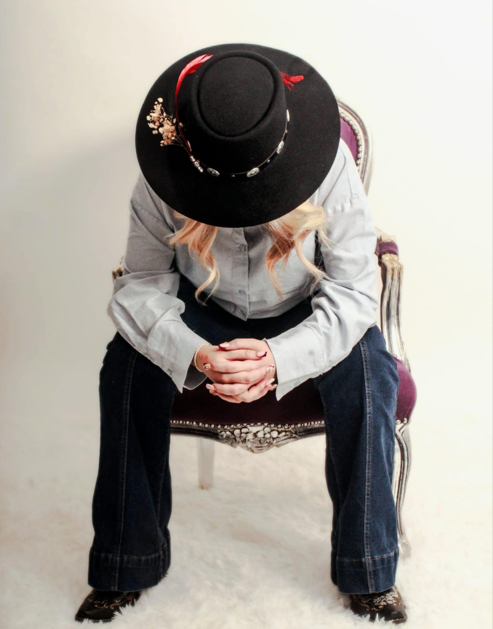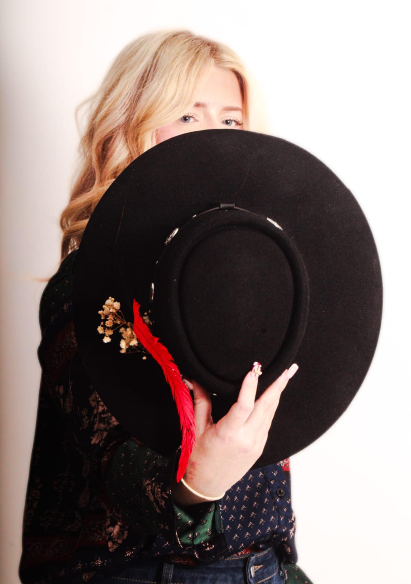 Step into your most confident self with The Raven. Crafted in bold black with an oval flat top crown, this statement piece features a genuine leather band adorned with gleaming silver concho and finished with wild, untamed details—a true raven feather and a single, striking red plume.